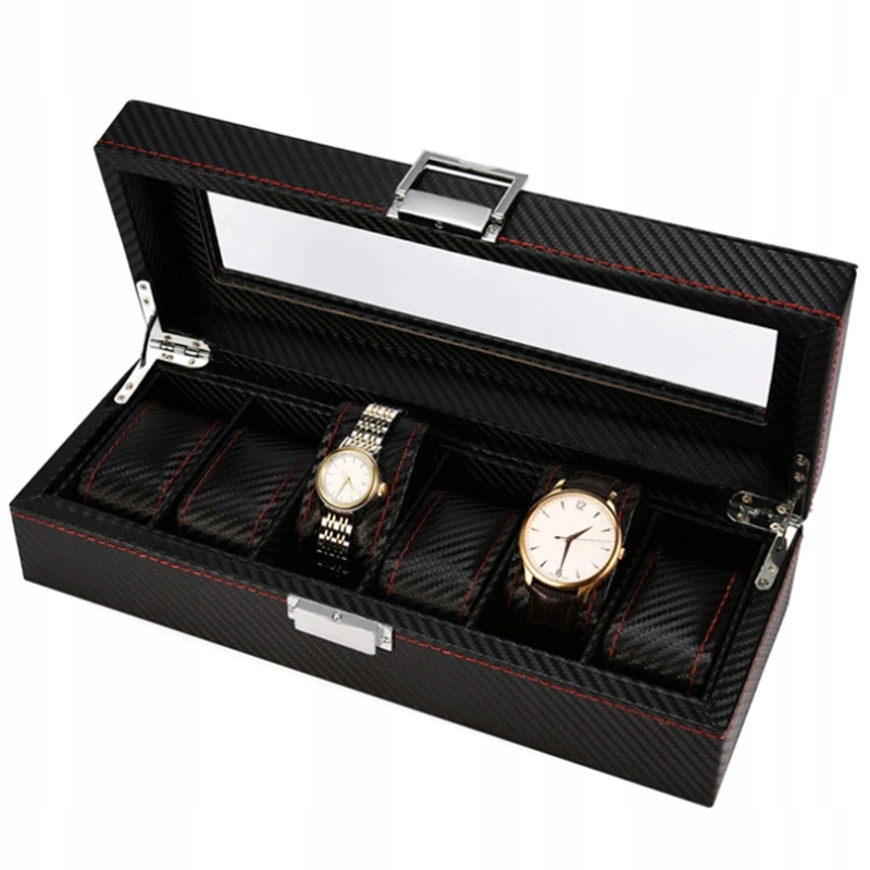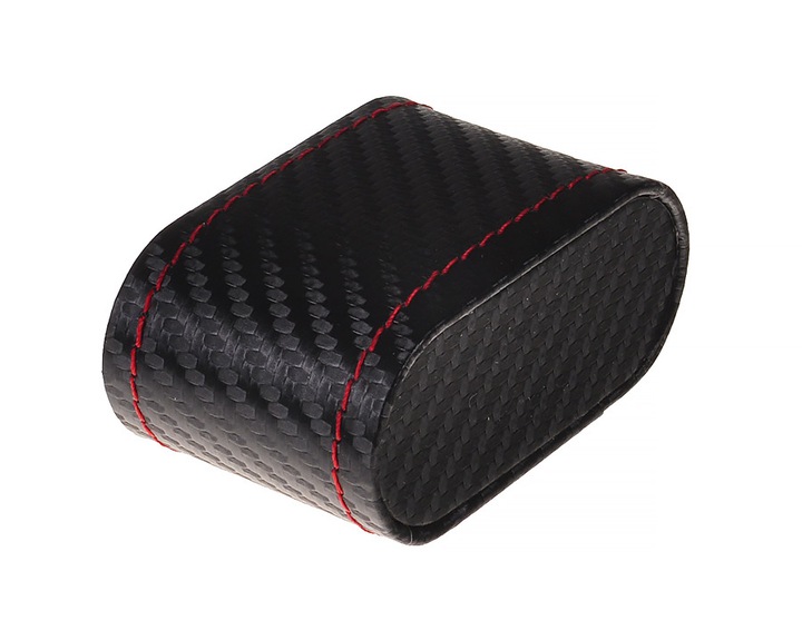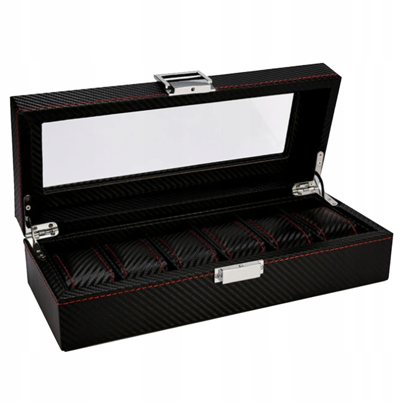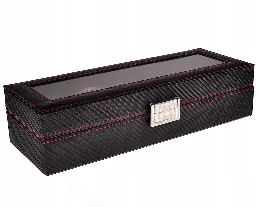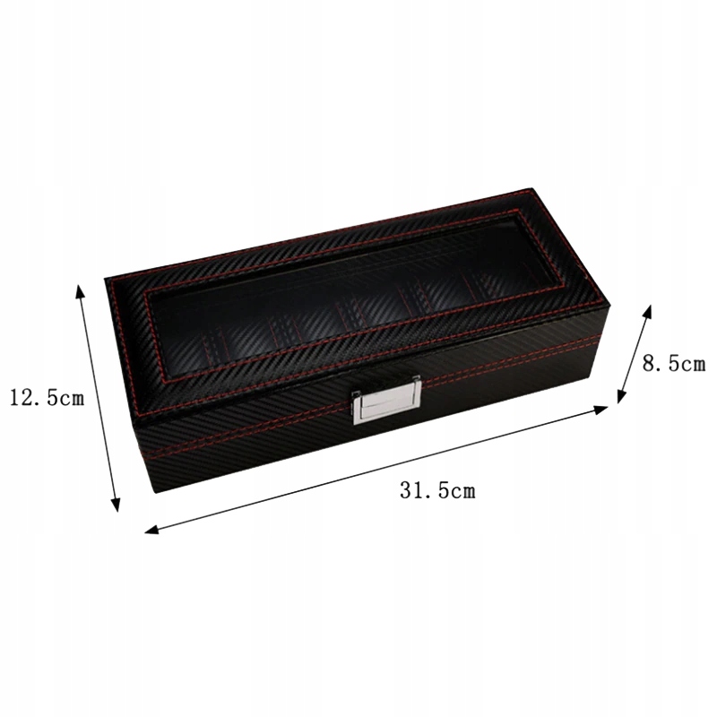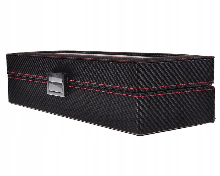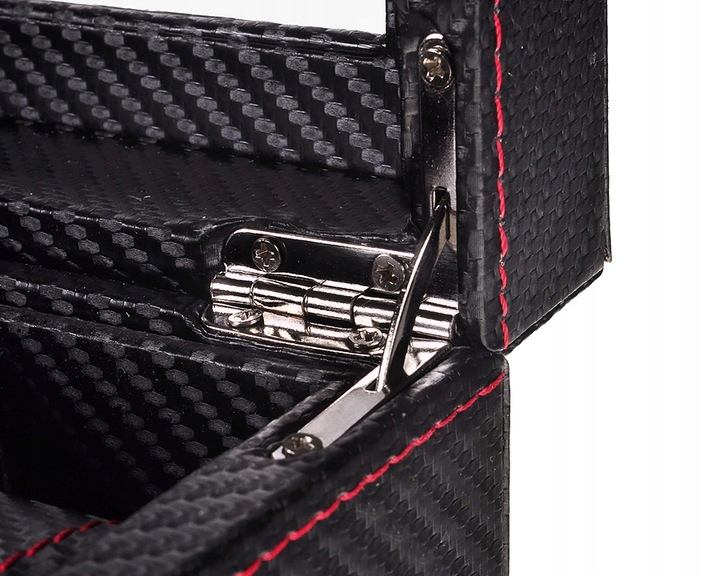 Solidne, eleganckie pudełko na 6 zegarków. Wykończone materiałem przypominającym karbon, oraz elegancką czerwoną nicią. Można w nim przechowywać zegarki lub po wyjęciu poduszeczki biżuterię lub inne drobiazgi.